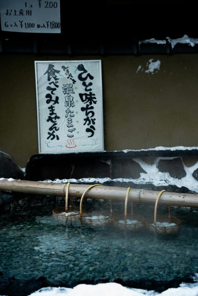 O onsen tamago é um prato típico, preparado cozinhando ovos em águas termais a cerca de 70 °C por 30 a 40 minutos. O resultado é uma clara macia e leitosa e uma gema cremosa e firme. É possível saboreá-lo em ryokans e restaurantes próximos a onsen.